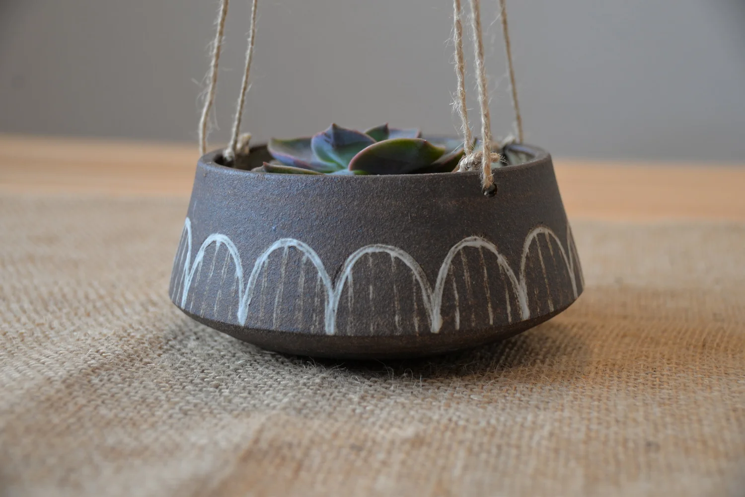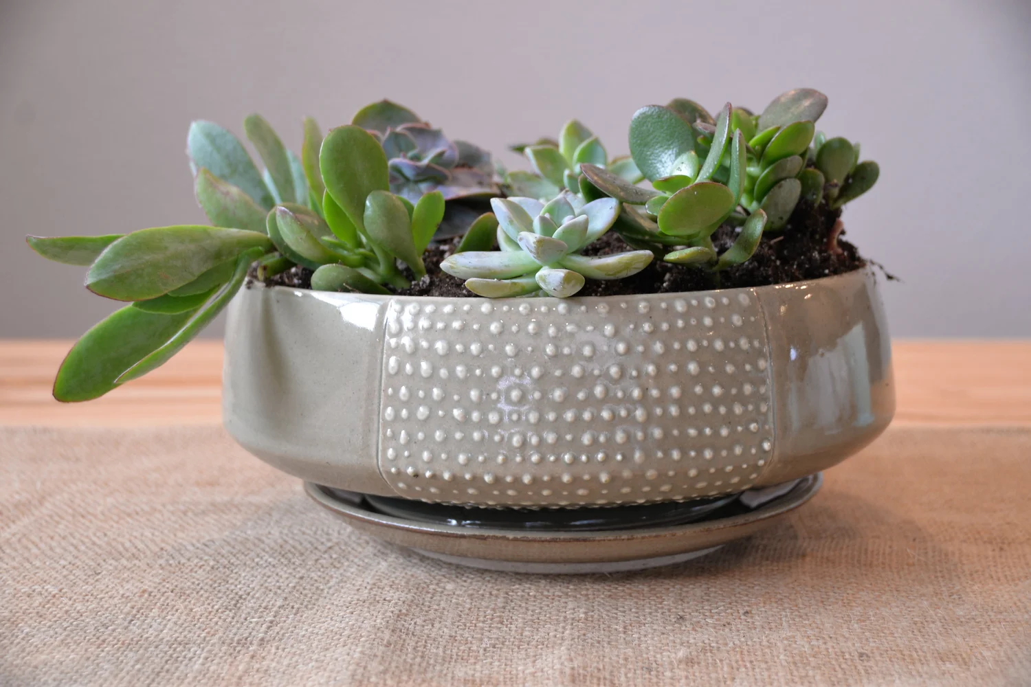 Scallop designed planter with porcelain detail dots & water catching tray.   Color: Eggshell
